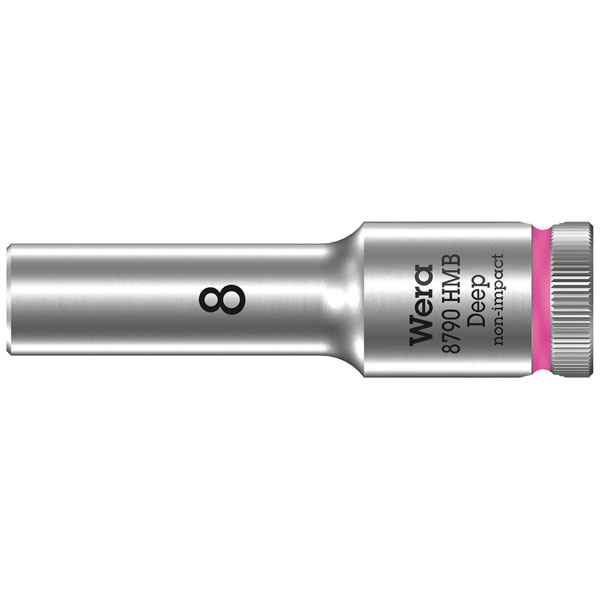 The Wera 8790 HMB Deep 3/8" socket 8 x 64mm is a long 3/8" hand and machine socket (ISO 2725 part 3) with ball intercept ring; for external hexagonal bolts and sockets.