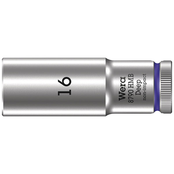 The Wera 8790 HMB Deep 3/8" socket 16 x 64mm is a long 3/8" hand and machine socket (ISO 2725 part 3) with ball intercept ring; for external hexagonal bolts and sockets.