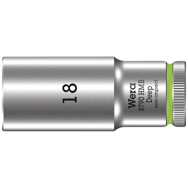 The Wera 8790 HMB Deep 3/8" socket 18 x 64mm is a long 3/8" hand and machine socket (ISO 2725 part 3) with ball intercept ring; for external hexagonal bolts and sockets.