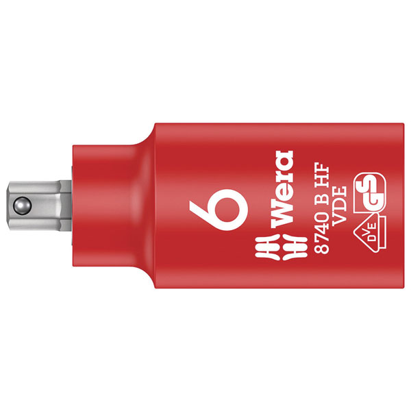 The Wera 8740 B VDE HF Zyklop Bit Socket Insulated HF 3/8" Drive 6 x 55mm is a VDE insulated 3/8" bit socket with holding function. Featuring a flexible locking ball to securely hold hexagonal socket screws; especially useful when working in hard-to-reach spaces. Increased safety is provided by the 2-component insulation with yellow insulation core, which becomes visible in case of damage to the outer red VDE insulation layer. Each tool is individually tested, as per IEC 60900 at 10,000 V for safe working at the approved voltage of 1000V.