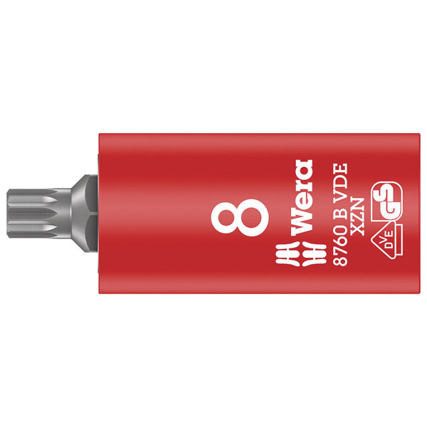The Wera 8760 B VDE XZN Zyklop Bit Socket 3/8" Socket Screw M 8 x 59 mm is a VDE insulated 3/8" bit socket designed for use with multi-point socket screws. Short, compact design is useful when working in hard-to-reach spaces. Increased safety is provided by the 2-component insulation with yellow insulation core, which becomes visible in case of damage to the outer red VDE insulation layer. Each tool is individually tested, as per IEC 60900 at 10,000V for safe working at the approved voltage of 1000V.