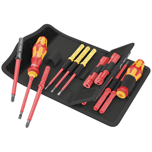 2x 817 VDE Kraftform bitholding screwdrivers, 12 VDE blades with Take it easy Tool finder: Colour coding by profile and laser-engraved size indication - for quick and easy identification of the required tool. 4 control cabinet keys. Individually tested at 10,000 V for safe working at the approved voltage of 1,000 V. In a robust belt pouch. The textile box features a fleece zone at the back. Using the provided self-adhesive hook and loop fastener strips, the textile box can be attached to the Wera 2go components. Or to the wall, shelf or workshop trolley.