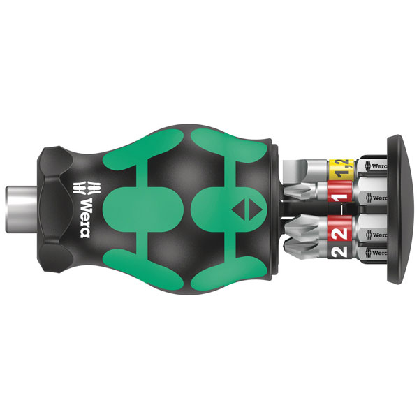 Wera 05008874001 Kraftform Kompakt Stubby Magazine 2, 6 pc - Particularly small bitholding screwdriver with short bit mounting for hard to reach areas. Includes 6 bits, which are located in a magazine in the handle. With only 65mm total length, the Kraftform Kompakt Stubby is a real mini screwdriving workshop. The strong permanent magnet in the bit mounting ensures secure holding of the bit. The 2-component handle with the practical combination of hard and soft zones allows for a firm grip and precise working. Take it easy tool finder: With size stamping and colour coding by output to find the required bit easily.
