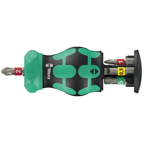 Particularly small bit holder with short bit mounting for hard-to-reach areas. The ratchet with fine toothing integrated in the handle allows fast working. Switching the screwdriving direction is intuitive: Turn the ring switch clockwise for clockwise screwdriving, turn it counterclockwise for counterclockwise screwdriving. Use position 0 to deactivate the ratchet mechanism for precise working. Includes 6 BiTorsion bits for a long product life, tough, for universal use. With Take it easy tool finder: with size stamping and colour coding by output to help you find the required bit easily. The strong permanent magnet in the bit mounting ensures secure holding of the bit. The 2-component Kraftform handle with the practical combination of hard and soft zones allows for a firm grip and precise working.