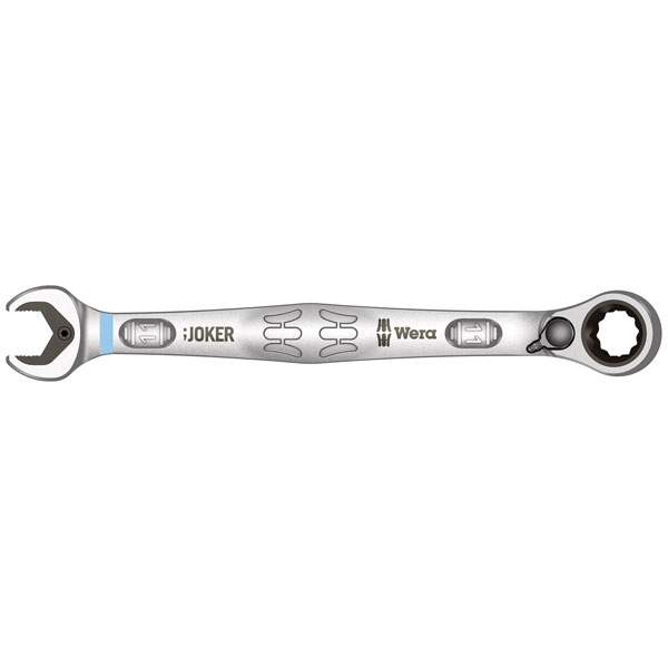 Joker ratcheting combination wrenches with angled ratchet head and switch lever. The metal plate in the jaw provides for the holding function which reduces the risk of losing nuts and bolts. The integrated limit stop can prevent any slipping from the bolt head downwards and enables higher torque to be applied. The exchangeable metal plate in the jaw securely holds nuts and bolts with its extra hard teeth and reduces the risk of slipping. The double-hex geometry delivers a very positive connection with nuts or bolts and again provides for a lower risk of any slipping. The low return angle of only 30° at the jaw end avoids any time-consuming flipping of the wrench when fastening. The reversible ratchet mechanism at the ring end with its fine toothing (80 teeth) ensures great flexibility even in confined spaces. Audibly precise ratchet mechanism. Additionally, the robust two-piece locking element provides for an extreme stability. Comes with a 15° tilted ratchet end for secure work even at high torque. The special forged geometry allows for high torque transfer and high flexural rigidity. Manufactured out of high-performance chrome-molybdenum steel with a nickel-chromium coating for high corrosion protection. With Take it easy tool finder: colour coding according to size.