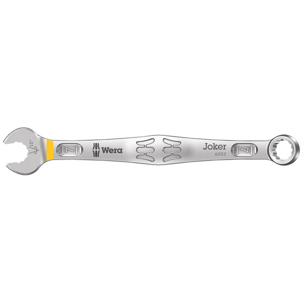 Wera 05020199001 6003 Joker Combination Wrench, 7 x 110 mm - As the installation space becomes increasingly tight during screwdriving, tools are necessary that enable users to work successfully even in such situations. Narrow spaces require additional placement points of the tool. Can spanners be modified so that the placement possibilities of the tool increase? The combination of the 7.5° pivoted mouth and the double hexagon geometry doubles the placement points.