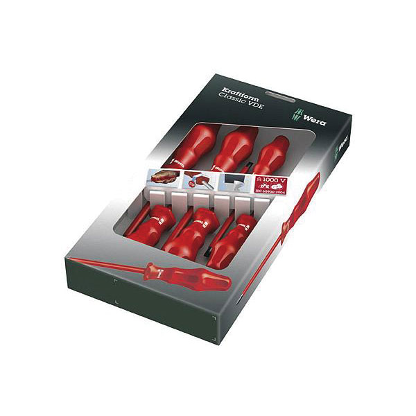 This set from Wera includes 6 Kraftform Classic VDE screwdrivers with slotted and Phillips blades.