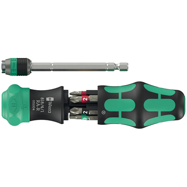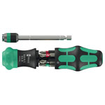 Kraftform handle with magazine for 6 bits integrated in the handle; with telescopic blade; for 1/4" hex drive bits. The ratchet with fine toothing integrated in the handle allows fast working. Switching the screwdriving direction is intuitive: Turn the ring switch clockwise for clockwise screwdriving, turn it counterclockwise for counterclockwise screwdriving. Use position 0 to deactivate the ratchet mechanism for precise working. The telescopic blade with Rapidaptor quick-release chuck, which can be retracted into the handle, allows quick manual screwdriving even in confined working situations when the blade is retracted. The blade can be extended by simply pressing the locking sleeve. The tool can now be used as a fully-fledged screwdriver. The telescopic blade can be removed and used as a machine adapter, as well as returned to its original position. The Rapidaptor technology of the bit holder makes for a quick bit change. Includes 6 BiTorsion bits for long product life, tough, for universal use; stored in the bit magazine integrated in the handle. The strong permanent magnet in the 1/4" bit mounting ensures a secure hold of the bit. The 2-component Kraftform handle with the combination of hard and soft zones allows for a firm grip and precise working. With a robust pouch.