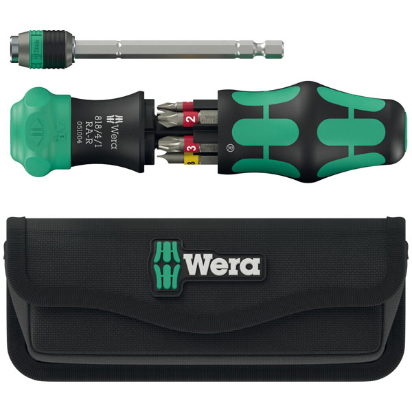 Kraftform handle with magazine for 6 bits integrated in the handle; with telescopic blade; for 1/4" hex drive bits. The ratchet with fine toothing integrated in the handle allows fast working. Switching the screwdriving direction is intuitive: Turn the ring switch clockwise for clockwise screwdriving, turn it counterclockwise for counterclockwise screwdriving. Use position 0 to deactivate the ratchet mechanism for precise working. The telescopic blade with Rapidaptor quick-release chuck, which can be retracted into the handle, allows quick manual screwdriving even in confined working situations when the blade is retracted. The blade can be extended by simply pressing the locking sleeve. The tool can now be used as a fully-fledged screwdriver. The telescopic blade can be removed and used as a machine adapter, as well as returned to its original position. The Rapidaptor technology of the bit holder makes for a quick bit change. Includes 6 BiTorsion bits for long product life, tough, for universal use; stored in the bit magazine integrated in the handle. The strong permanent magnet in the 1/4" bit mounting ensures a secure hold of the bit. The 2-component Kraftform handle with the combination of hard and soft zones allows for a firm grip and precise working. With a robust pouch.