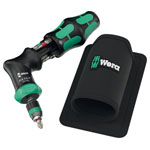Kraftform pistol handle for 1/4" hex drive bits. The ratchet with fine toothing integrated in the handle allows fast working. Switching the screwdriving direction is intuitive: Turn the ring switch clockwise for clockwise screwdriving, turn it counterclockwise for counterclockwise screwdriving. Use position 0 to deactivate the ratchet mechanism for precise working. The Rapidaptor technology of the bitholding screwdriver makes for a quick bit change. Includes 6 BiTorsion bits for a long product life, tough, for universal use; stored in the bit magazine integrated in the handle. The strong permanent magnet in the 1/4" bit mounting ensures secure holding of the bit. The 2-component Kraftform pistol handle allows for high leverage. The robust holster can be attached to the belt.