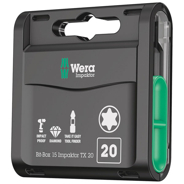 Wera 15 piece set of high quality impact bits for TORX® screws in a practical Bit-Box for easy removal. 1/4" hex, suitable for DIN ISO 1173-D 6.3 bit holders.