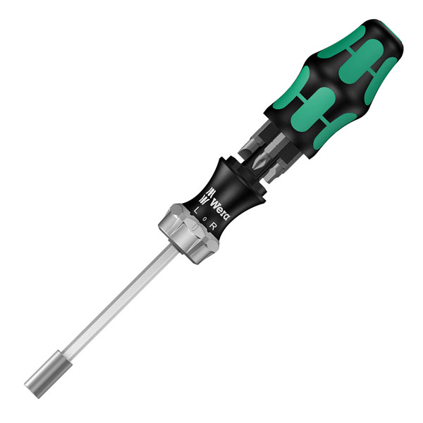 This set from Wera includes a Kraftform Kompakt ratchet screwdriver with 1/4inhexagon chuck and hexagonal blade, switchover ring and strong permanent magnet, plus multi-component non-roll Kraftform handle with integrated magazine, suitable for use with hexagon insert bits. The set also includes a selection of 6 bits for slotted and crosshead screws.