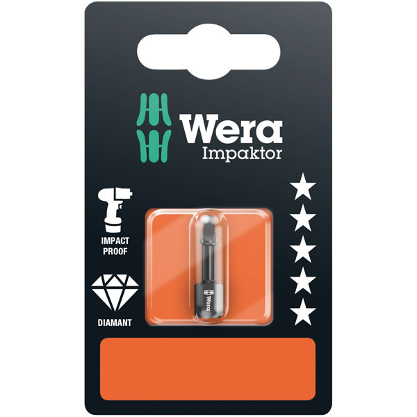 This 1/4in hexagon drive Impaktor diamond square socket screw bit from Wera is suitable for use with impact screwdrivers. These high strength bits are easily recognisable due to their black colour.