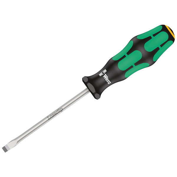 Wera Series 334 flared tipped slotted screwdriver with chrome plated and hardened steel blades. The Wera Lasertip tip bites into the screw head, reducing cam out (prevents slipping out of the screw head) and eliminating the need for two handed screwdriving.