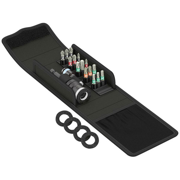 Compact Wera tool set with the 17 most common screwdriving tools for patio construction. Bits in stainless steel design prevent extraneous rust. With extra smart bit holder, which enables a uniform depth thanks to the variable screw depth limitation, and prevents damage to decking with the fitted felt ring.