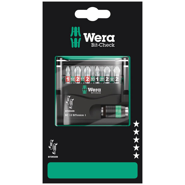 Tough-absorbing bits for universal use. BiTorsion bits with a torsion zone - where kinetic energy is diverted from peak loads. This greatly extends the product service life. Offer the best possible service life with the appropriate holder. Comes with Rapidaptor technology, which allows bits to be attached without any need to actuate the sleeve. The removal of the bit is simple, just by pushing the sleeve forward - for rapid bit change with just one hand. For the take-up of bits with 1/4" hexagon head drive as per DIN ISO 1173-C 6.3 und E 6.3. For insertion in the power screwdriver or into the chuck of the power drill. The multi-component Bit-Check is convincing on account of its low weight and the maximum possible degree of compactness. In this respect, the soft material in the lower section of the Bit-Check ensures that the bits are securely held whilst being simple to remove at the same time. The profile and size of the bits are easy to recognise thanks to the Wera Take it easy Tool Finder with its colour coding and clearly visible imprint.