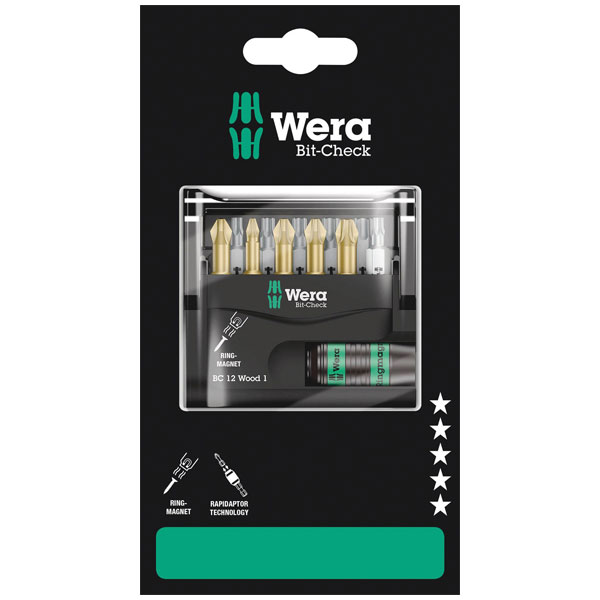 Robust Bit-Check by Wera. Bit-Checks provide a quick overview of the tools available. Bits not needed are simply reinserted into the set and do not get lost. Simple transportation e.g. in the shirt pocket. Includes universal holder with ring magnet - which very securely holds even heavy screws - and Rapidaptor, which allows bits to be attached without any need to actuate the sleeve. Can be inserted in the power screwdriver or for use in the chuck of the electric drill. Multi-component Bit-Check that can be positioned upright for permanently secure bit storage.