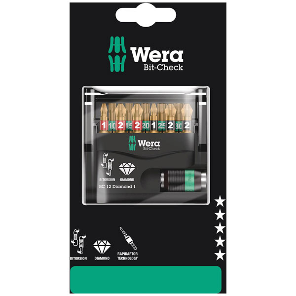 Bits with tiny diamond particles on the bit tip. This ensures a secure fit in the screw head, reduces the contact pressure required and lowers the risk of slipping. BiTorsion bits with a torsion zone - where kinetic energy is diverted from peak loads. This greatly extends the product service life. Comes with Rapidaptor technology, which allows bits to be attached without any need to actuate the sleeve. The removal of the bit is simple, just by pushing the sleeve forward - for rapid bit change with just one hand. For insertion in the power screwdriver or into the chuck of the power drill. The multi-component Bit-Check is convincing on account of its low weight and the maximum possible degree of compactness. In this respect, the soft material in the lower section of the Bit-Check ensures that the bits are securely held whilst being simple to remove at the same time. The profile and size of the bits are easy to recognise thanks to the Wera Take it easy Tool Finder with its colour coding and clearly visible imprint.