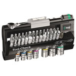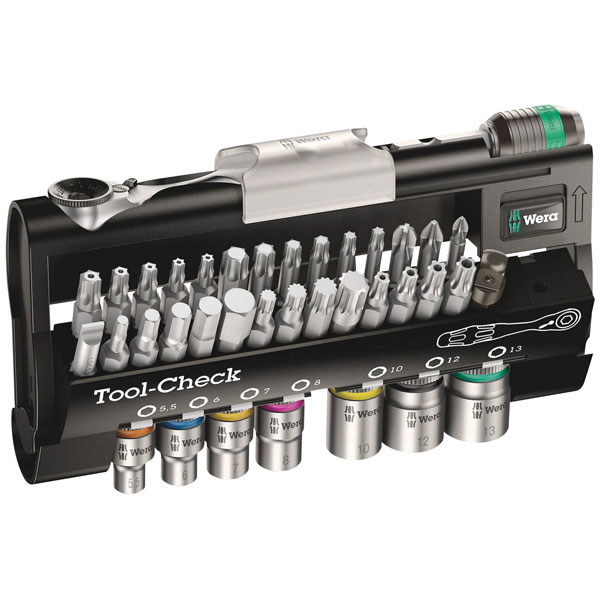 28 bits; 1 870/1 socket adaptor (1/4" hexagonal to 1/4" square); 7 manual & power tool sockets; 1 Rapidaptor bit holder; 1 Wera Bit Ratchet Zyklop Mini 1, with drop-forged steel design suitable for the fitting of bits with 1/4" hexagonal headed drive as per DIN ISO 1173-C 6.3 and E 6.3 (ISO 1173), i.e. Wera Series 1 and 4. Can also be used with 1/4" sockets by using the socket adaptor (870/1).