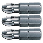 A pack of 3 ¼in. (6.3mm) hex drive screwdriver bits with Pozidriv size 0, 1 & 2 tips.