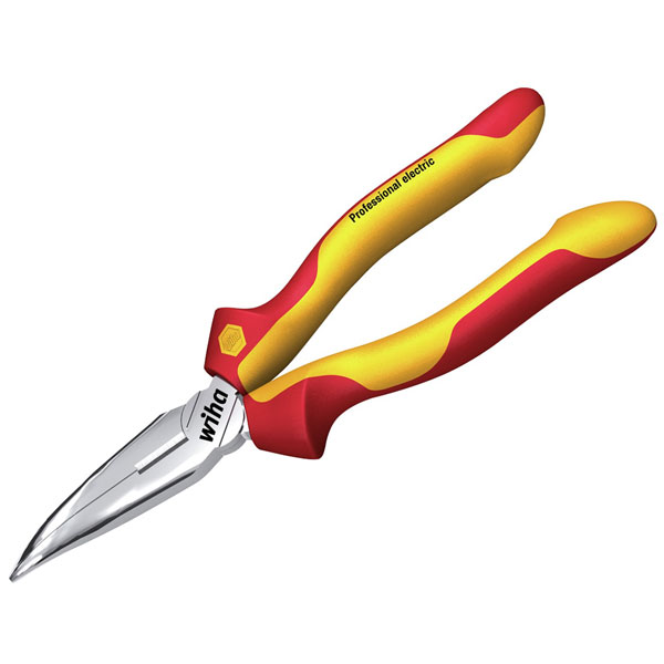 The Wiha Professional electric Bent Needle Nose Pliers come with a curved cutting edge, approx. 40°. Ideal for gripping and holding as well as cutting soft and hard wires, and cables. A high-quality, chrome-plated surface to prevent corrosion.