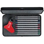 Set includes the following blades: Slotted 4 x 0.8/6 x 1.0 and 5.5 x 1.0/6.5 x 1.2; Phillips PH1 and PH2; Pozidriv PZ1 and PZ2; hex 4/4, 5/5 and 6/6; TORX® T10/T15, T20/T25 and T30/T40.
