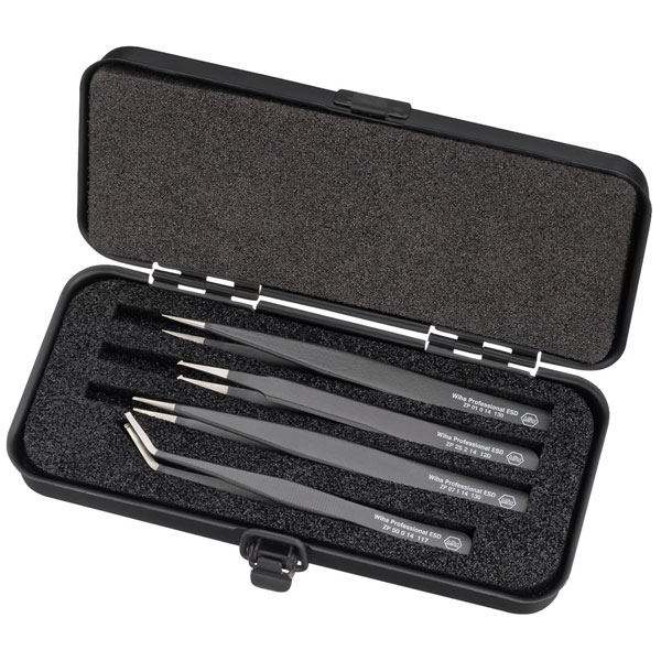 This Wiha Professional ESD SMD Tweezer Set are for the most common applications. Electrostatically conductive tools protect electronic components from damage. Conforms to DIN EN 61340-5-1.