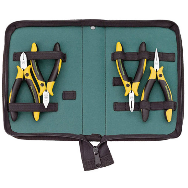 Universal set for all cutting work in the electronic range. Execution: ESD-tools manufactured according to IEC 61340-5-1. All pliers made of high-quality tool steel, hardened and finely polished.Clamp grips of all the components as well as conductive. Surface resistance 10^6 - 10^9 ohm. Contents: ctting pliers wo fct, 115 mm (Z 41 3 04 series) side cutter with wadding, 115 mm (Z 44 1 04 series) Oblique Cutting Nippers almost without facet, 110 mm (Z 46 4 04 series) flat round pliers 120 mm (Z 36 0 04 series) pocket: light and space-saving storage of the tools.