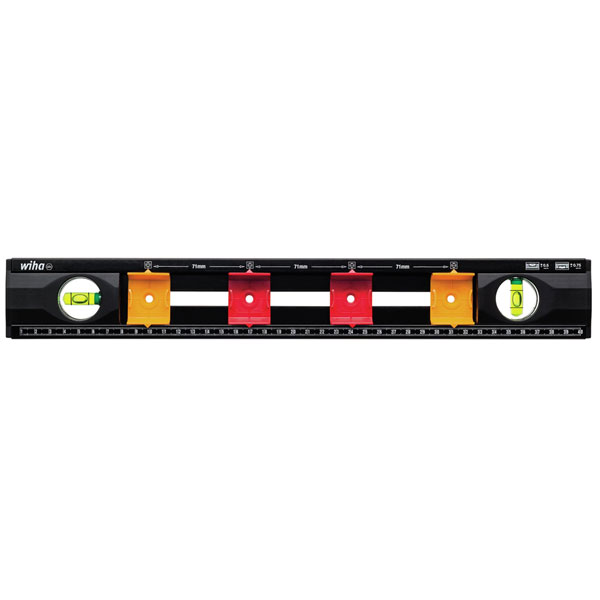 The Wiha Electrician's Spirit Level is built for measuring and marking vertical and horizontal distances between flush boxes. End-to-end casing allows electricians to mark out lines without needing to stop. The ingeniously positioned linear scales ensure users can measure in comfort, even when viewing from above. Both level bubbles can be seen easily, even from an acute angle.
