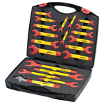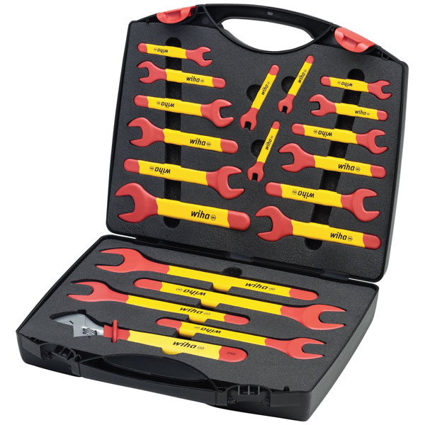 Increases your efficiency: Improved accessibility at narrow points through 15° jaw position. Offers you full protection: Each tool individually tested at 10,000 V AC and approved for 1,000 V AC. Protects your material: Fully insulated tool reduces the risk of short circuits. When working on live parts, the safety of the user is paramount. With the tool set including a single-jaw open-end wrench and adjustable wrench, electricians and electricians are best equipped for work on electrical systems. With an open-end position of 15°, the insulated single-jaw open-end wrenches are perfectly suited for the installation of terminals and sleeves at narrow points. The adjustable adjustable adjustable adjustable fork wrench, which is also included, has a maximum opening width of 30 mm. Damage to sensitive surfaces is minimized by the particularly smooth and parallel jaws. The tools included in the set are subjected to routine testing in accordance with the international standard IEC 60900 and enable safe working in the range of live parts up to 1,000 V AC. Application: Safe installation of terminals and sleeves, conductor connections, screwing of conductor rails. The protective insulation lets you work on components carrying voltages up to 1,000 V AC.