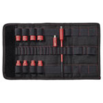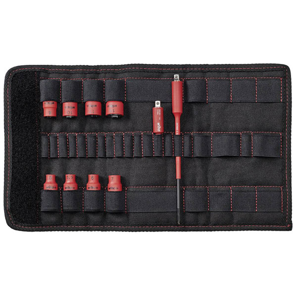 When working on different locations such as, for example, control cabinets and electrical systems for many different screw profiles are required. The 10-pcs. Set covers with its selection of socket inserts the most common glands and is so flexible in use. In combination with speedE ®, slim VARIO ® and TorqueVario ® tools, the socket wrench inserts for the tightening and loosening hexagon screws can be used. Securely stowed and arranged in a sturdy folding bag are the electrician tools perfect for mobile use. The bag also offers sufficient space for other slimVario ® and TorqueVario ® S products. Especially in cramped work environment prevent the fully insulated tools when are bridged accidentally contact of two conductors a short-circuit. Every tool in the set has been developed according to the international standard IEC 60900 a Parts Inspected and enables a safe working on live parts up to 1000 V AC. Use: For working on live parts up to 1,000 V AC. Ideal for mobile use and in cramped work environment.