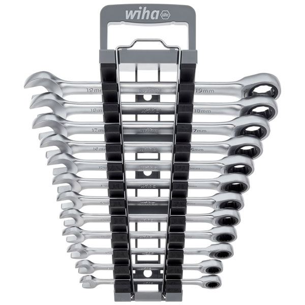The Wiha Ring Ratchet Spanner Set, 12 Piece, is made from high-quality, chrome vanadium steel with a corrosion-resistant and easy-to-clean surface.