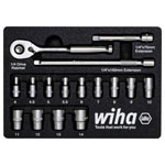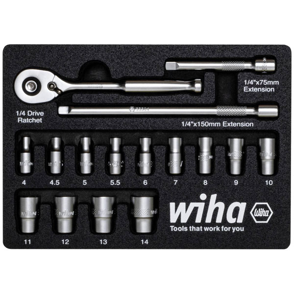 Opening strongly tightened screws requires enormous effort. With the socket wrench inserts from Wiha the user gets every screw connection simply opened. With the set of the 13 most common 1/4" socket wrench inserts in the sizes of 4 - 14 mm, a ratchet wrench and two extensions the user is best equipped. The enclosed ratchet wrench, in combination with the selection of plug-in keys, gives the user the necessary flexibility in the work application. When working with the ratchet wrench, the user has a short return angle thanks to the fine teeth with 72 teeth. The forward/reverse operation can be adjusted variably by means of the integrated changeover lever. In combination with the enclosed extensions, low-lying nuts and screws can be easily reached. The socket wrenches and extensions are locked mechanically. The change is made by pressing the release button. Made of high-quality chromium-vanadium steel, the socket wrench inserts stand for durability and robustness, not least thanks to their corrosion-resistant and easy-to-clean surface. The entire set content is arranged and clearly stored in a foam insert, in which the quick finding of the suitable socket wrench is supported by markings.The handy surface helps in this, too strong grip even in oily or wet working situations.