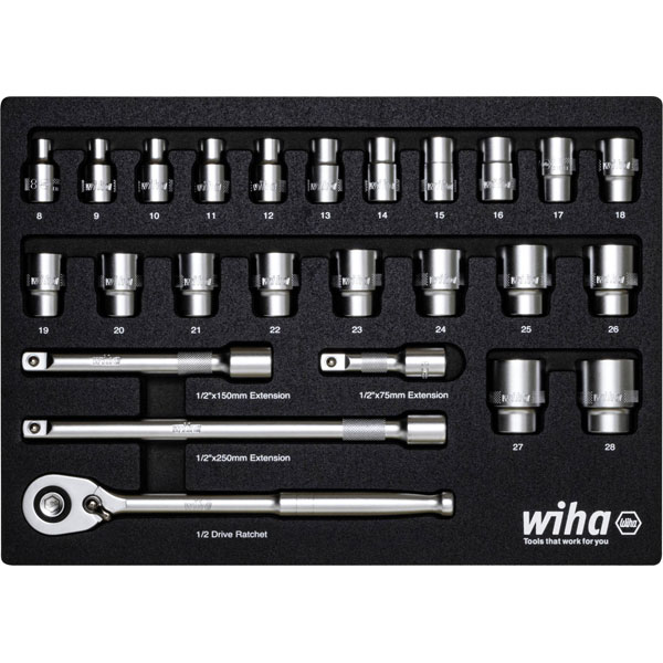 Opening strongly tightened screws requires enormous effort. With the socket wrench inserts from Wiha the user gets every screw connection simply opened. With the set of 21 most common 1/2" socket wrench inserts in the sizes of 8 - 28 mm, a ratchet wrench and three extensions the user is best equipped. The enclosed ratchet wrench, in combination with the selection of plug-in keys, gives the user the necessary flexibility in the work application. When working with the ratchet wrench, the user has a short return angle thanks to the fine teeth with 72 teeth. The forward/reverse operation can be adjusted variably by means of the integrated changeover lever. In combination with the enclosed extensions, low-lying nuts and screws can be easily reached. The socket wrenches and extensions are locked mechanically. The change is made by pressing the release button. Made of high-quality chromium-vanadium steel, the socket wrench inserts stand for durability and robustness, not least thanks to their corrosion-resistant and easy-to-clean surface. The entire set content is arranged and clearly stored in a foam insert, in which the quick finding of the suitable socket wrench is supported by markings.