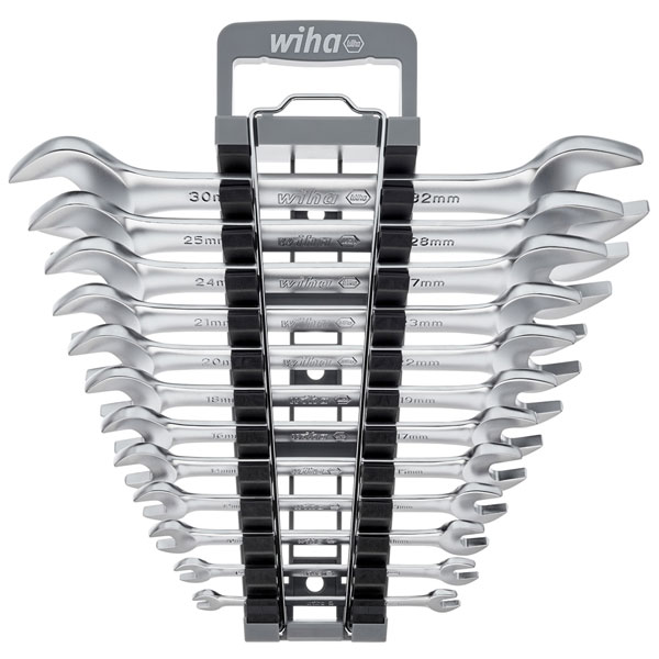 The Wiha Double Open-End Spanner Set, 12 Piece, is made from high-quality, chrome vanadium steel with a corrosion-resistant and easy-to-clean surface. The design enables high leverage without force, making it easy to open any fastening.