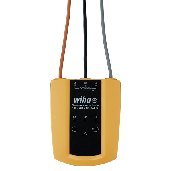 This Wiha Rotational Field Indicator comes with an integrated phase display. The rotation direction as well as the live phases are reliably identified with the help of an LED display. A crocodile clip included with the delivery allows a simple connection, e.g. with a motor terminal board.