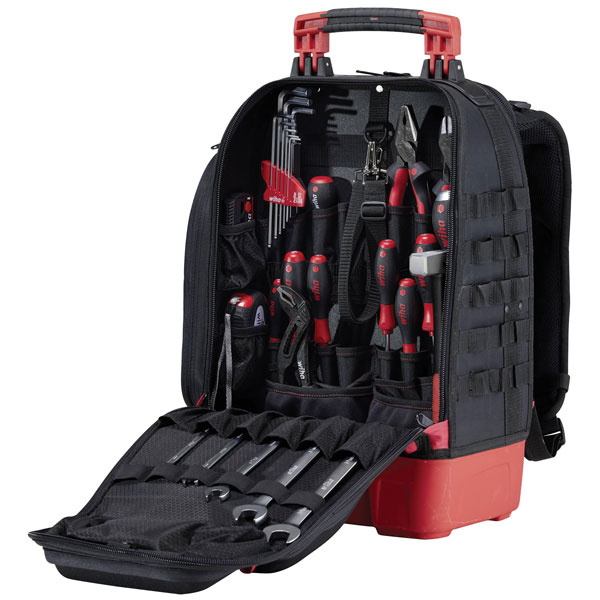 Wiha Mechanic tool backpack 43-piece. With mechanic basic equipment, stable floor and laptop compartment incl. Bags for accessories.