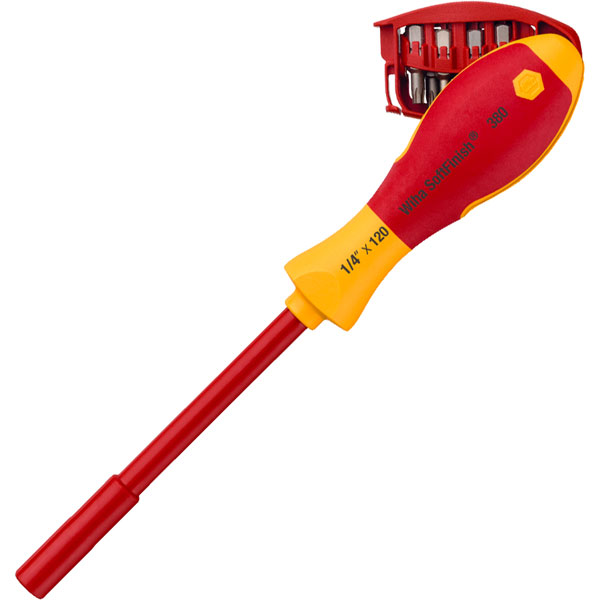 A Wiha SoftFinish Screwdriver Bit Holder with a choice of 8x standard ¼in. hex bits contained inside the handle.
