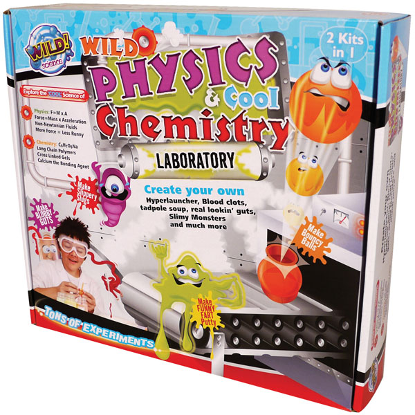 Buy the Wild Physics & Cool Chemistry Laboratory - Discover bouncy ball-istics and slippery slimes! Create ghastly blood clots and exploding slugs, grow gruesome tapeworms, and shock your family with fart-putty and bouncing do-dos - all by the magic of chemistry! Make Cosmic Ray Launchers and Supersonic Bouncers. Discover the science of elasticity, polymers, energy and motion with this fascinating science kit!