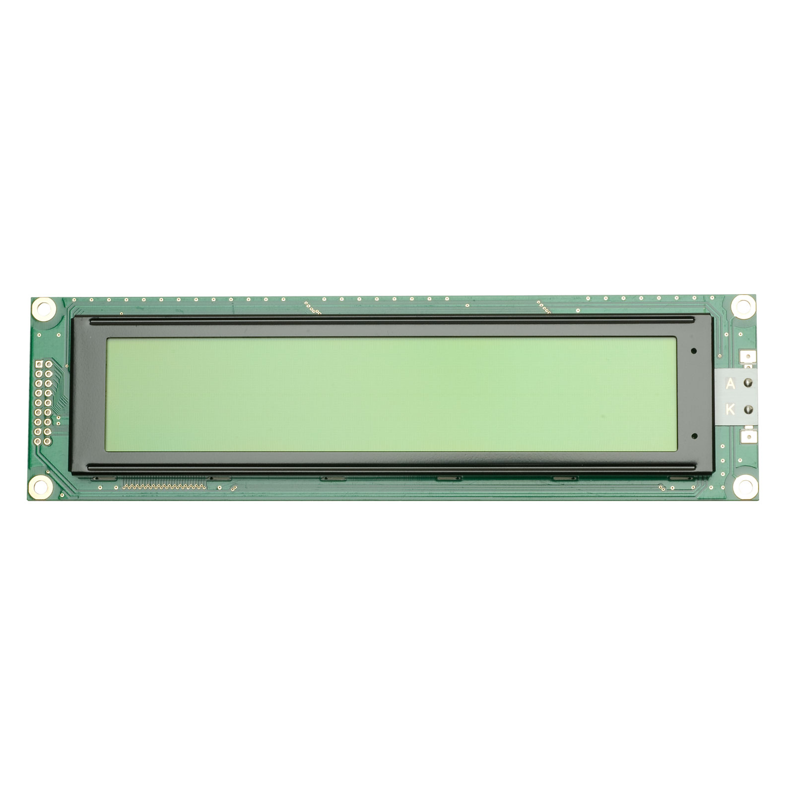 A 40 x 4 LCD display that has a transflective type 6 o'clock display with a STN positive yellow/green LCD module that has a yellow/green LED backlight.