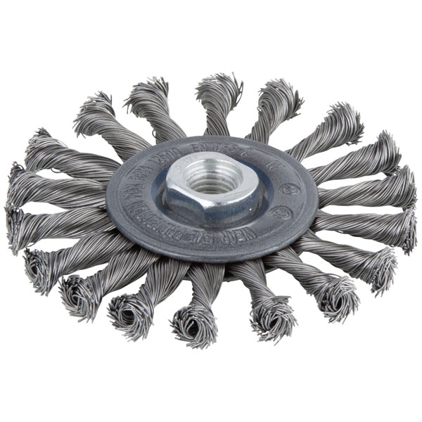 Wolfcraft's Steel wire disc brush is designed with a 115 mm diameter and an M14 thread for secure attachment. This machine tool wire brush is ideal for cleaning, deburring, and rust removal on metal surfaces. Made for durability and efficient performance, it suits both professional and DIY applications.