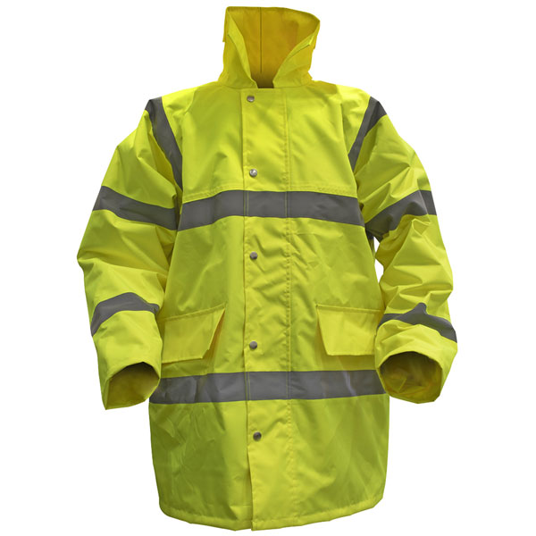 Waterproof motorway jacket with full quilted lining for greater warmth and comfort. Fitted with retractable hood, two outer pockets, inner phone pocket and both zipper and snap closing for added protection against rain. Conforms to EN ISO 2047:2013+A1:2016 Class 3 and EN 343:2003+A1:2007 Class 3:3.