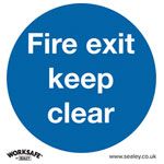 Mandatory safety sign which is self-adhesive vinyl and measures 200 x 200mm. Fire exit keep clear.