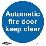 Mandatory safety sign which is rigid plastic and measures 80 x 80mm. Automatic fire door keep clear.
