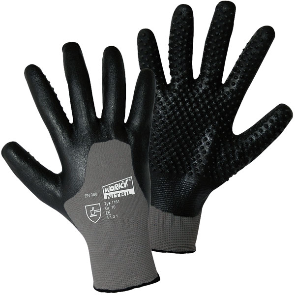These 100% grey nylon gloves from Worky have a black nitrile dotted coating and are ideal for use in the automobile industry, construction and logistics work.