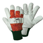 These Worky Forestry Protection Gloves are made from smooth cow grain leather with an orange coloured nylon back and green knitted wrist, and are designed for use patricularly in forestry work and other industiral situations where plenty of hand protection is required.