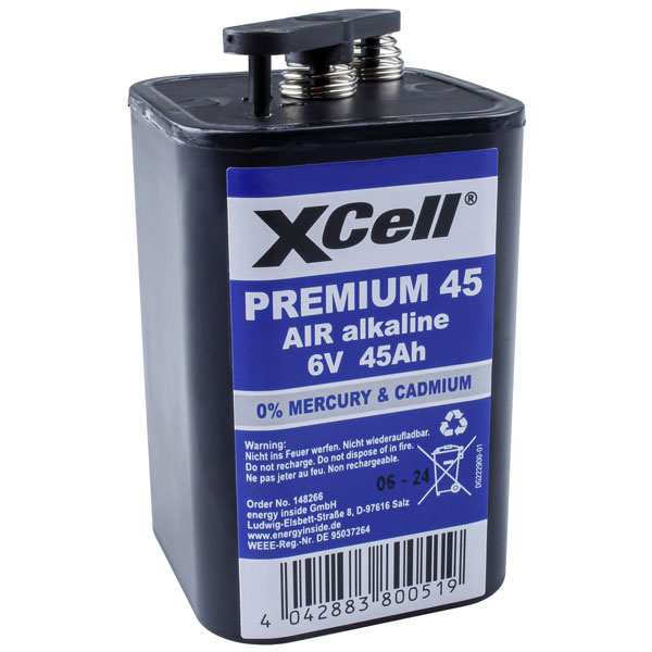 The XCell Premium 45 is a non-standard battery featuring coil spring contacts and a zinc air composition. It delivers a robust 6 V and a high capacity of 45000 mAh, designed for special purpose and custom applications. This battery is commonly used in devices requiring reliable and long-lasting power.