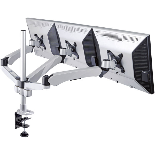 This rotating triple monitor bracket from Xergo has two attachment points by articulation. It pivots, can be tilted and is adjustable in height, while the telescoping feature allows you to adjust the viewing distance to the monitor as needed. It is adjustable up to 360° and tilting up to 105°.