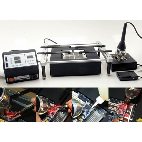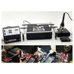 The IR860 rework system consists of a ceramic pre-heater, an infra-red solderlight and a controller. The solderlight is designed especially for SMD/BGA rework and is also very convenient for re-balling smaller BGA components. When used in conjunction with the pre-heater, the system will achieve remarkable improvements in quality and efficiency of SMD/BGA rework operations. In normal operation, the pre-heater supplies 75% of the heating from below with the remaining 25% from above via the solderlight. Heating from both sides reduces the risk of damage to components and the circuit board due to uneven expansion when only one side is heated.