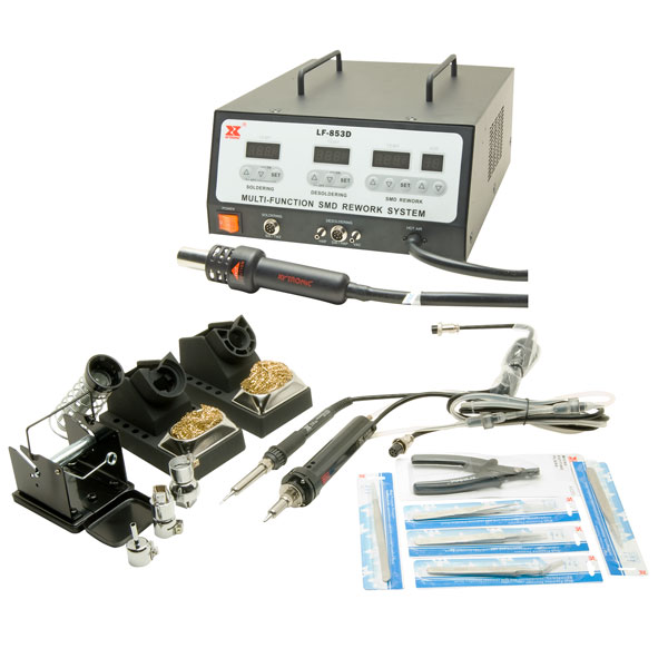 The Xytronic Multi-Function SMD Rework System LF-853D is designed to handle your most challenging rework & repair jobs while saving you work space with its unique "three in one" design. Specializing in lead free soldering/desoldering, surface mount devices with temperature controlled hot air.